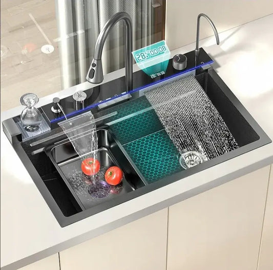 Chiuveta Multifunctionala RelaxU ©,din Otel Inoxidabil cu 2 cascade, jet spalare pahare, tocator din lemn natural si 2 cuve pentru spalat, 75 cm x 46 cm x 22cm